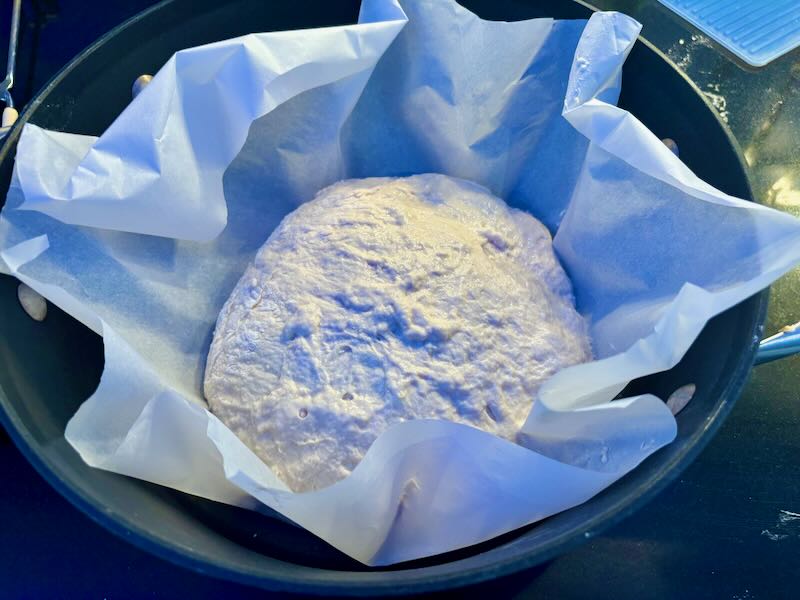 Once shaped, I place it on parchment paper, which makes transferring it to the Dutch oven simple and mess-free. The parchment also prevents sticking and helps lift the bread out once it’s baked.