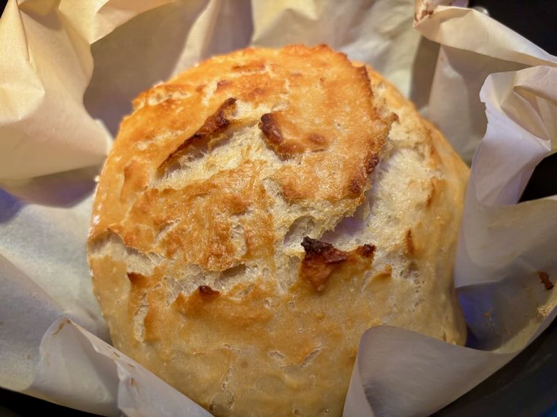 As it bakes, the kitchen fills with the comforting scent of warm yeast and toasted flour. When you finally lift the lid, you’re rewarded with a loaf that looks like it came from an artisan bakery: golden, round, and beautifully blistered.